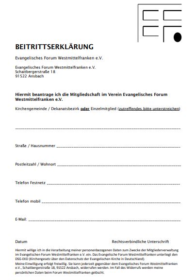 Hier können Sie sich, als Kirchengemeinde oder als Einzelmitglied das neue Beitrittsformular für das Evangelische Forum Westmittelfranken e.V. herunterladen.